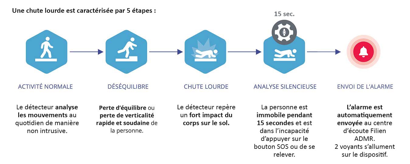 Chez Filien ADMR, ce service se présente sous la forme de capteurs discrets placés au sein du domicile. Ce matériel fait office de détecteurs de mouvement connectés à un boîtier téléphonique fonctionnant sur le réseau de téléphonie mobile. L’ensemble de ce dispositif analyse en continu l’activité du senior. En cas de suspicion de chute, au lever du lit par exemple, il envoie automatiquement un appel vers le centre d’écoute 24h/24 qui vient en aide à la personne.